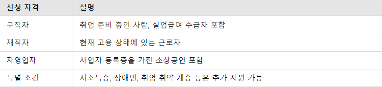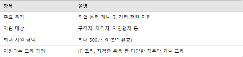구직자뿐만 아니라 재직자, 자영업자 등도 해당 카드를 통해 지원받을 수 있어, 직업적 상황에 상관없이 사용할 수 있습니다.