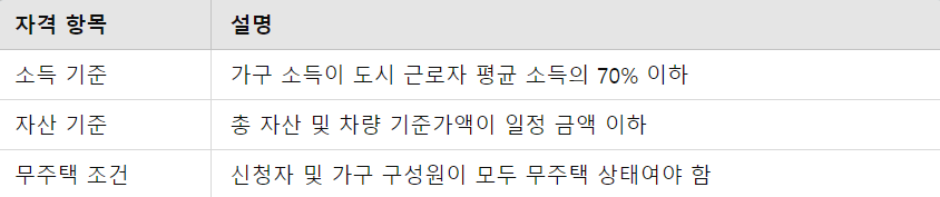 신청 가구의 월평균 소득이 전년도 도시 근로자 가구의 월평균 소득의 70% 이하일 경우 신청할 수 있습니다. 가구원 수에 따라 소득 기준이 달라지며, 이를 초과할 경우 신청이 제한될 수 있습니다.
