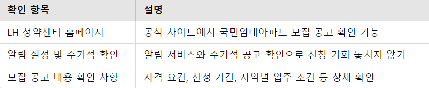 국민임대아파트 청약은 정해진 시기에 이루어지므로, LH 청약센터 또는 LH 홈페이지를 통해 모집 공고를 확인해야 합니다. 공고에는 모집 대상, 지역, 자격 조건 등이 상세히 안내되어 있습니다.
