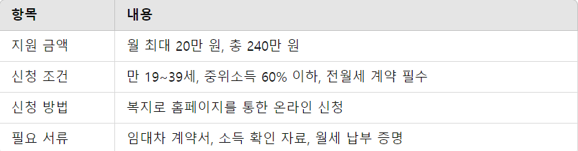 주거비 부담을 덜어주는 월세 지원금으로, 최대 240만 원까지 지원받을 수 있습니다.