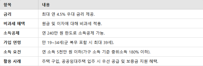 기존 청약통장의 혜택을 강화하여 청년들에게 맞춤형 주거 혜택을 제공합니다.