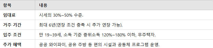 SH공사 청년 임대주택은 서울 내 청년들이 경제적 부담 없이 안정적으로 거주할 수 있도록 다음과 같은 특징을 가지고 있습니다