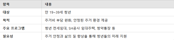 청년 주택은 만 19~39세 청년층을 대상으로 정부와 지자체가 주도하여 제공하는 주거 지원 프로그램입니다. 주거 비용 부담이 큰 청년들에게 안정된 생활공간을 제공하고, 경제적 부담을 완화하는 데 목적이 있습니다.