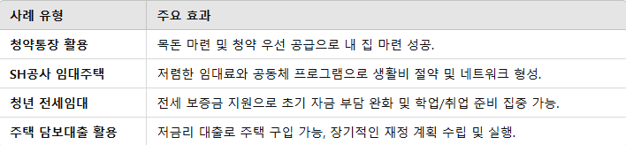 이 사례들은 청년 주택이 단순히 주거 공간을 제공하는 것을 넘어, 청년들의 경제적 자립과 사회적 안정에 얼마나 중요한 역할을 하는지 보여줍니다. 주거 문제로 고민하는 청년이라면, 자신의 상황에 맞는 청년 주택 프로그램을 적극적으로 활용해 보세요.
