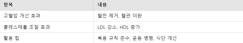 ● 효과: 심혈관 질환 예방, 혈압 안정화.